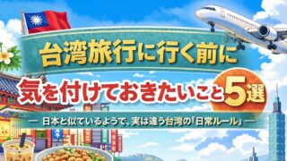 グルメ・旅行系 台湾旅行に行く前に気を付けておきたいこと5選 台湾旅行を安心して楽しむために、日本人が事前に知っておきたい注意点を5つ紹介。服装、サービス、謝罪文化、現金事情など、日本との違いをやさしく解説します。 2025.12.17 グルメ・旅行系