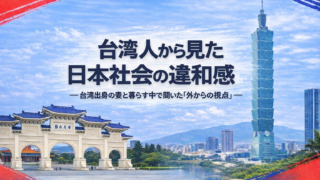 日本と台湾比較・生活系 台湾人から見た日本社会の違和感 台湾出身の妻と日本で暮らす中で聞いた、日本社会への違和感とは何か。服装の自由度、サービス、謝罪文化の違いを夫の視点からやんわり整理します。 2025.12.17 日本と台湾比較・生活系
