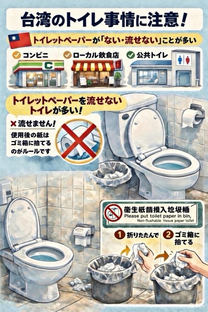 👉 トイレットペーパーを流せないトイレが多い